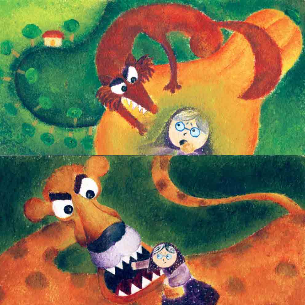 یکی بود یکی نبود. یه پیرزنی بود. یه روز خواست بره دیدن یه دونه دخترش . کارهاشو رو به راه کرد و در خونه اش رو بست و رفت و رفت و رفت تا رسید به کمرکش کوه، که یک دفعه یه گرگ گنده سر و کله اش پیدا شد، جلوش دراومد و گفت : آهای ننه پیرزن کجا می ری؟ بیا که وقت خوردنت رسیده…